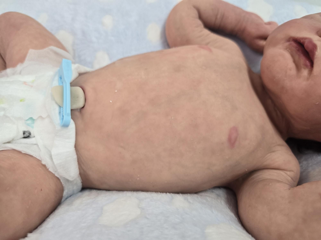 Lleva pelo injertado color castaño oscuro y ojos azul newborn
